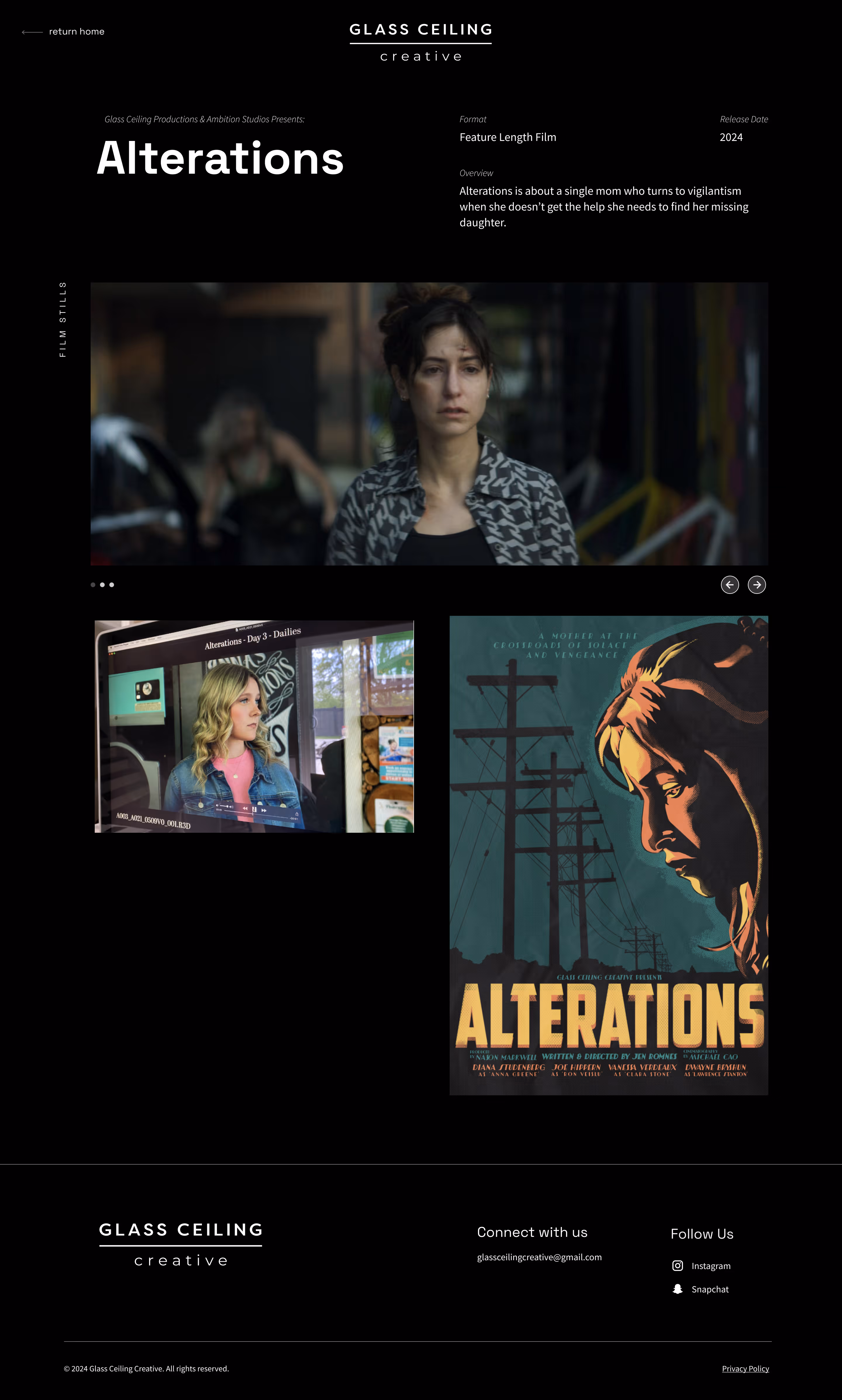Glass Ceiling Creative, an independent film company, came to me in need of a cohesive brand identity and digital presence. They required a logo that would translate across mediums, a title animation that could be used in feature-length films, and a website that would showcase upcoming projects while reflecting the company’s creative vision. The main challenge was to create a brand that felt cinematic and professional while still allowing the films themselves to take center stage.